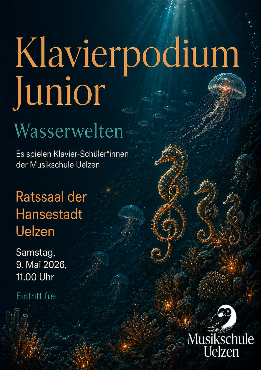 Am Samstag, den 9. Mai 2026, um 11:00 Uhr lädt die Musikschule für Landkreis und Hansestadt Uelzen e.V. zum diesjährigen Klavierpodium-Junior in den Ratssaal der Hansestadt Uelzen ein. Unter dem Motto „Wasserwelten“ präsentieren junge Pianistinnen und Pianisten aus allen Klavierklassen der Musikschule ein abwechslungsreiches Konzertprogramm.
